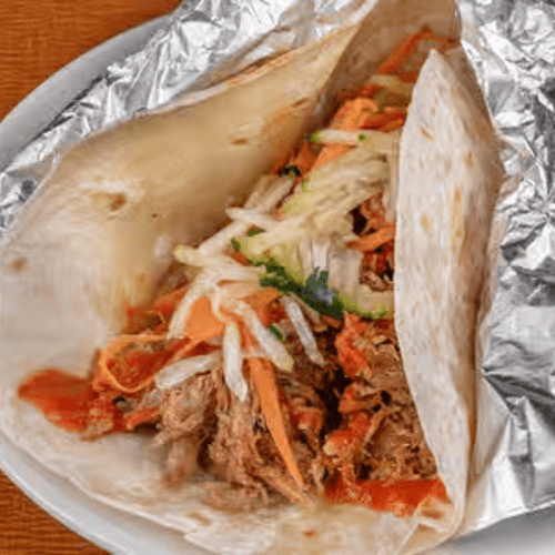 Slow cooked shredded pork with traditional spices topped with red cabbage, cilantro and house made chipotle vinaigrette