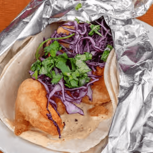 Tempura-fried fish, red cabbage, special sauce and cilantro
