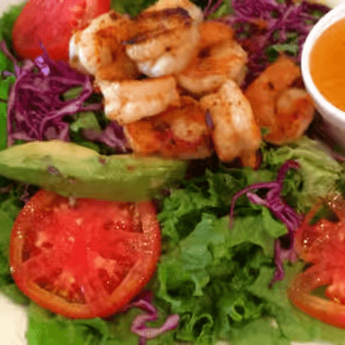 Mixed Greens, tomato, sliced avocado, and 8 sautéed shrimp