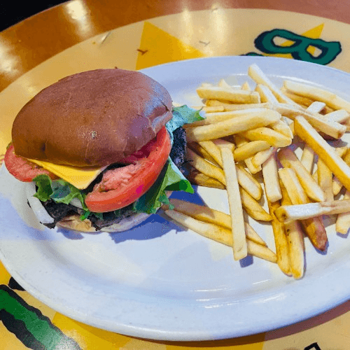 Our Famous Baja Burger crafted with Angus beef and pepper jack cheese on a jalapeño cheese bun garnished with grilled onions, poblano and bell peppers