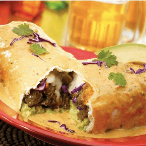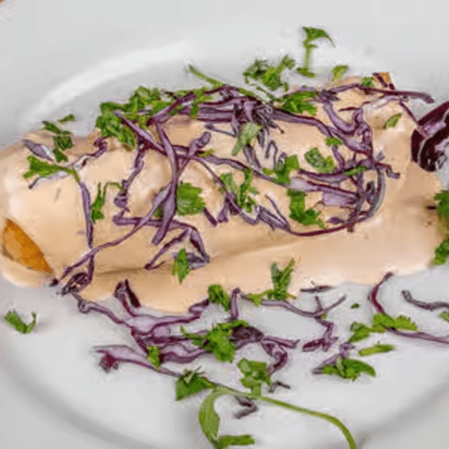 Fajita chicken, fajita beef or ground beef, with guacamole, red cabbage and cheese covered with vinaigrette cream sauce