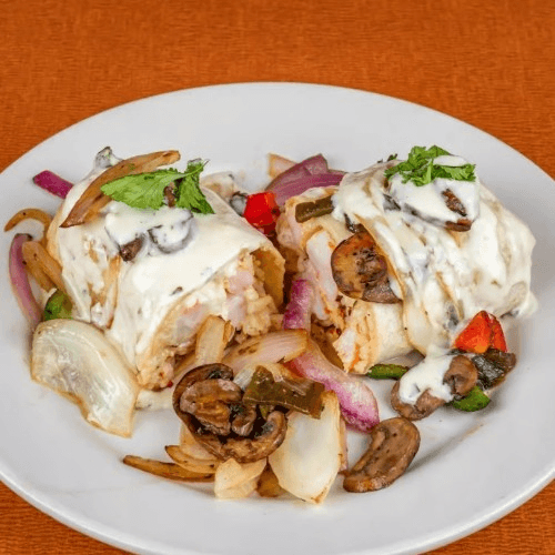 Grilled shrimp and fish, rice, grilled onions, peppers, mushrooms and cheese topped with light cream sauce and garnished with cilantro
