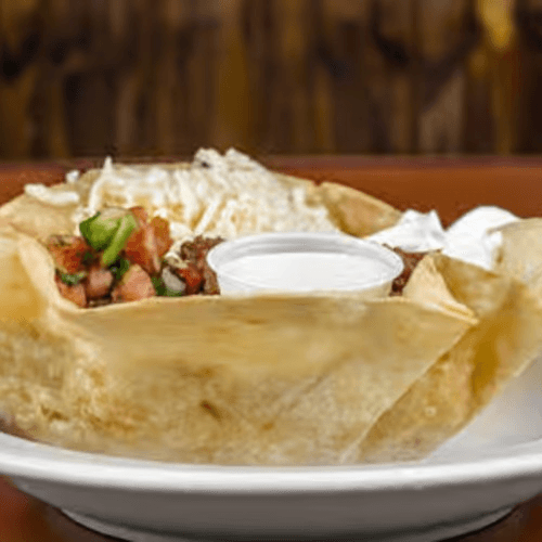 Iceberg lettuce, pico de gallo, sour cream, shredded cheese and choice of protein.