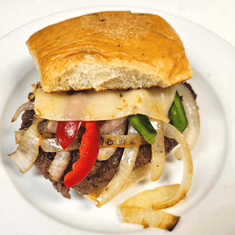 Angus beef and pepper jack cheese on a jalapeño cheese bun with grilled onions, poblano and bell peppers