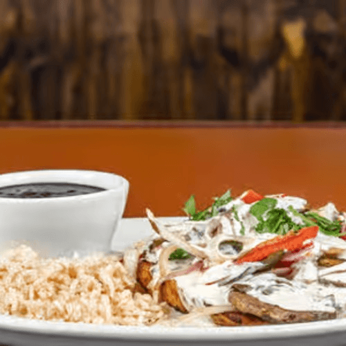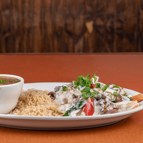 Grilled chicken breast smothered with mushroom, onions, poblano peppers and cilantro in a light cream sauce, served over rice with a side of beans