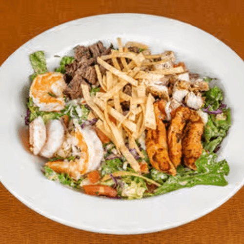 Greens with tortilla strips, pico de gallo and shredded cheese with choice of protein, tossed in our house dressing